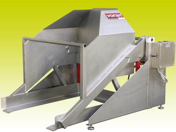 El equipo está concebido para volcar y elevar contenedores de gran tamaño (bins o palots), facilitando su vaciado en pasos controlados sin necesidad de intervención manual continua. El dispositivo está diseñado para trabajar con contenedores estándar de 1.000 × 1.200 × 970 mm o con contenedores especiales de 1.250 × 1.200 × 970 mm. Tanto la estructura como sus componentes en contacto con el producto están fabricados en acero inoxidable, con pies de apoyo que garantizan la estabilidad durante la operación.