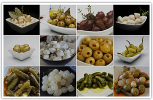 Aceitunas negras, aceitunas verdes, Ajo blanco, Cebollitas, Pepinillos, Piparras