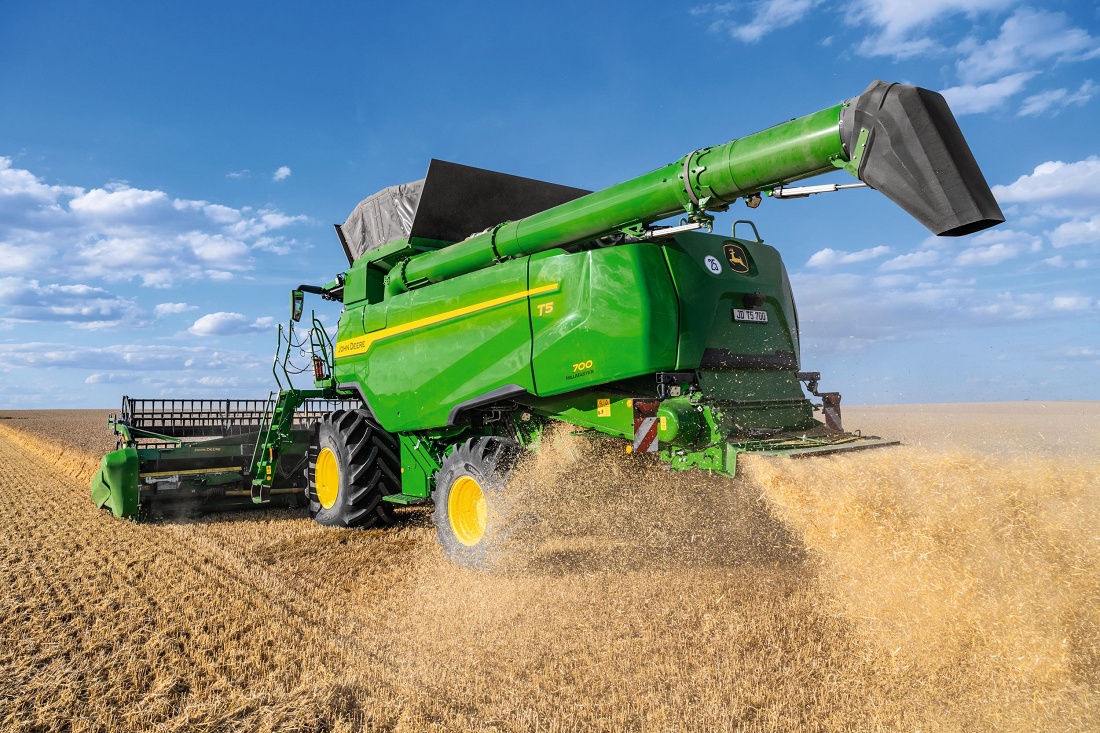 La serie T5 de John Deere agrupa cosechadoras de sacudidores con varios modelos (T5 400, T5 500, T5 600, T5 700) pensadas para explotaciones de tamaño medio, con buen rendimiento y flexibilidad.