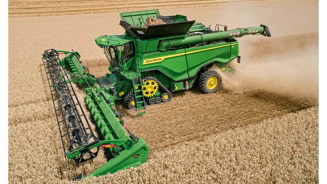 También incorpora opciones de automatización y confort: cabina moderna, controles ergonómicos, diseño pensado para jornadas largas, y posibilidad de adaptar cabezales de corte muy anchos (hasta ~13,7 m), lo que permite cubrir más superficie por pasada.